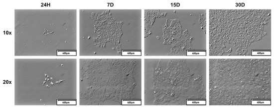 The representative images of oviductal epithelial cells (OECs) primary long-term in vitro culture taken after 24 h, 7, 15, and 30 days of culture using an inverted microscope with relief phase contrast.