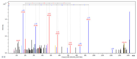 The nano liquid chromatography-matrix-assisted laser desorption/ionization-time of light tandem mass spectrometry (nanoLC-MALDI-TOF/TOF MS/MS) analysis allowed for the identification of the total number of 3240 unique tryptic peptides, which correspond to 389 proteins. The representative example of the mass spectrum (m/z 1417.6834), which was identified as one of the fascin peptides, is shown in Figure 3. In the database used, there was no possibility to restrict the search to the Sus scrofa species. Hence, the “Other mammals” database was searched, which yielded some proteins assigned to species other than pig. The list of those proteins was presented in Supplementary Table S1. As they were detected in porcine samples, it can be assumed that these proteins are homologues of those found in Sus scrofa. Moreover, some additional searches were made including “Homo sapiens” and “Rodentia” datasets, in order to complete obtained molecular pattern. Results were presented in Tables S2 and S3.