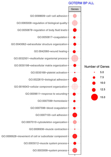 Selected genes were analyzed according to an already published sequence [77]. Briefly, the genes were uploaded to the Database for Annotation, Visualization, and Integrated Discovery software (DAVID, Laboratory of Immunopathogenesis and Bioinformatics, Frederick, MD, USA) [78] to extract enriched GO BPs. Only GO BPs containing at least five genes and with a p-value lower than 0.05 were chosen.