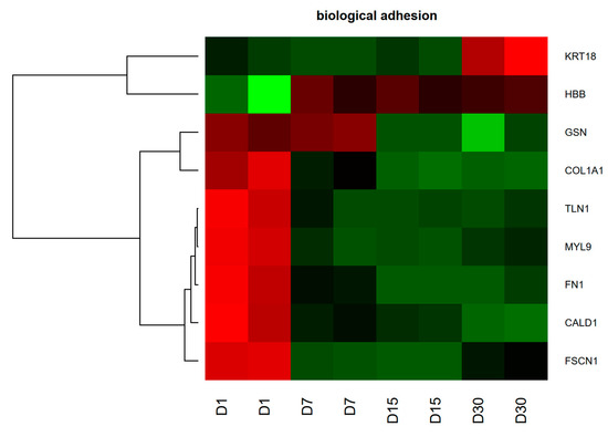 In this manuscript, we focused on the genes that belong to “biological adhesion” GO BP. The hierarchical clustering of selected genes was carried out and result was presented as a heatmap (Figure 5).
