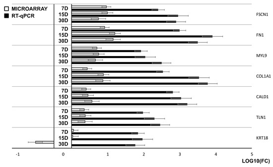 The results of the microarray and real-time quantitative polymerase chain reaction (RT-qPCR) analyses presented in a form of a bar graph.