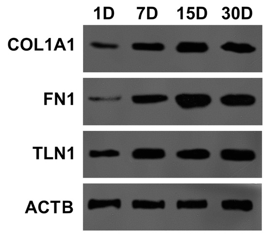The changes in Collagen Type I Alpha 1 Chain (COL1A1), Fibronectin 1 (FN1), Talin 1 (TLN1), and Actin Beta (ACTB) proteins expression in 24 h, 7, 15, and 30 days of OEC culture.