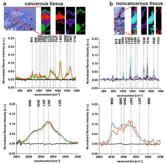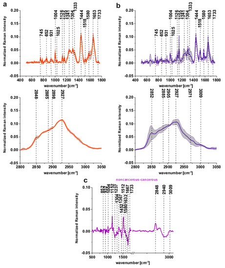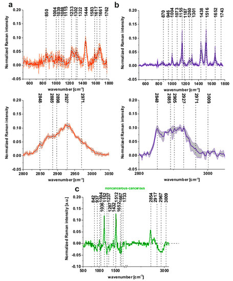 Figure 2a,b shows that, for the noncancerous tissue, higher contribution in sample composition, compared to the cancerous one, is observed for carotenoids (peaks at 1152, 1512 cm−1) [22,23,24,25,26,27,28,29], lipids and fatty acids, including unsaturated fraction (peaks at 1432, 1733, 2854 and 3009 cm−1) [33,34,35]. On the contrary, for the cancerous tissue, significant contribution is observed for glucose (peak at 842 cm−1) [36], collagen type I (peaks at 937, 1036 cm−1) [37], nucleic acids (phosphodiesters group of nucleic acids at 1287 cm−1) [38], proteins in beta-sheet conformation (Amide I 1667 cm−1 peak typical for structural proteins modes of tumors) [35]; phosphate stretching modes originate from the phosphodiester groups of nucleic acids, which suggests an increase in the nucleic acids in the malignant tissues at 1237 cm−1 and methyl groups of lipids and fatty acids, cholesterol and cholesterol esters (peak at 2967 cm−1) [35], and nucleosides (790, 852, 1287, 2917 cm−1) [39].