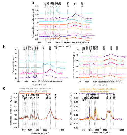 To confirm which individual organic components mainly contribute to the Raman spectra of the tissues, the mean Raman spectra of the noncancerous and cancerous tissues can be compared with typical Raman spectra of: DNA, unsaturated lipids (glyceryl trioleate), proteins including structural proteins (collagen, actin, myosin), nucleoside (cytidine), and natural antioxidants (beta-carotene) in Figure 4a–c.