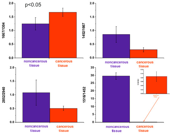 The ratio of Raman intensities of selected bands, such as 1667/1304, 1452/1667, 1516/1452, and 2848/2940 cm−1, are accepted as a good source of information on the ratio of proteins/lipids; proteins (peak typical for malignancy)/Amide I, carotenoids/proteins, and lipids/proteins respectively.
