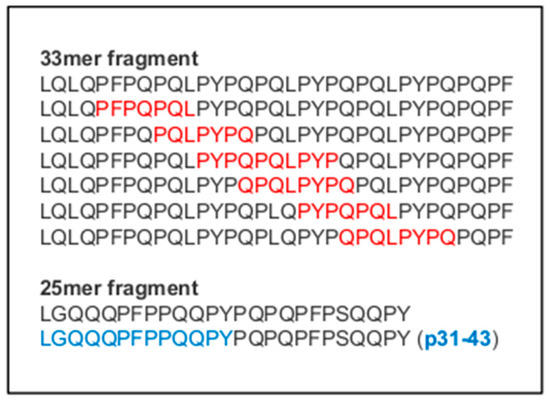 Amino acid sequence of the 33-mer and 25-mer fragments of the α-gliadin. Major immunogenic epitopes are indicated in red, while the sequence of the non-immunogenic fragment p31-43 is shown in blue.