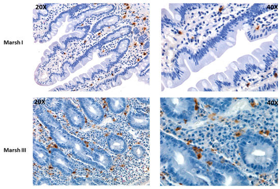 In a recent work of Losurdo and colleagues, 20 subjects with non-coeliac gluten sensitivity (NCGS) and 16 CD patients (classified as Marsh 1 and Marsh 2) were enrolled to investigate the specific expression of markers of adaptive and innate immunity activation in the course of the disease. The authors specifically identified intestinal MCs by CD117 staining (i.e., the receptor for SCF that is constitutively expressed by mature MCs) and demonstrated that MCs accumulate in the intestinal mucosa of both NCGS and CD patients [87]. In the same year, by analysing and scoring the intestinal biopsies of CD patients for immune cells infiltration (including B, T-cells as well as macrophages and MCs) according to Marsh classification, the histological damage progression in CD has been associated with the density of infiltrating MCs (Figure 2) and their ability to bind the non-immunogenic gliadin p31-43 peptide and to release inflammatory mediators in response to p31-43 [88].