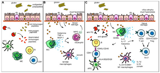 Gluten peptides, once deamidated in situ by TG2, activate a T-cell specific response, which is believed to play an essential role in the pathogenesis of CD. The anti-gluten immune response in CD is further characterized by increased epithelial permeability [6] and increased influx of gluten peptides to the lamina propria [7].