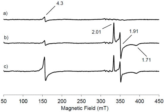 Figure 1a, the NDO in its resting state contains an oxidised Rieske cluster, which is EPR-silent, due to the antiferromagnetic coupling and a partially reduced mononuclear iron centre. Following the treatment of NDO with the reducing agent dithionite, a new EPR signal appears in the g region around 2 originating from the reduction of the Rieske-type cluster (