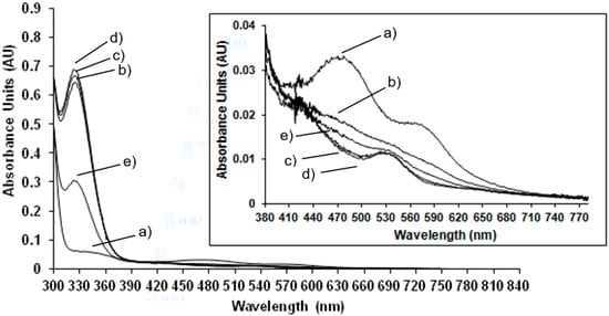 Figure 2 trace a) the predominant S-Fe(III) charge transfer contribution results in a very broad adsorption band in the visible and near-UV region: maxima at 340 nm and 470 nm and a shoulder at 570 nm are detected (the wavelength region of 380 to 800 nm is magnified in the inset of