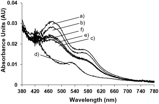 Figure 4. The spectra show the same absorbance bands at 470 and 570 nm of the Rieske-type in its resting state confirming that this site is not affected by the addition of hydrogen peroxide and ruling out any roles in the oxidation of substrate in the peroxide shunt pathway.