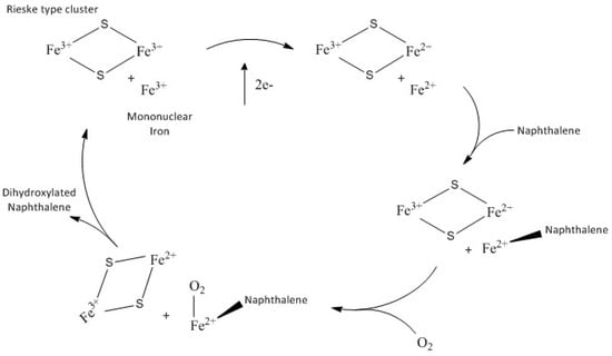 14]. To perform the natural cycle the enzymatic system consists of NADPH reductase that contains FAD and a [2Fe-2S] cluster; an electron transfer protein, NDF, with a Rieske-type cluster; and an oxygenase unit (NDO). The overall reaction stoichiometry requires two electrons and an oxygen molecule to hydroxylate the naphthalene substrate. The general accepted catalytic cycle for dioxygenases [