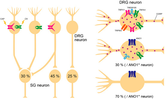 Nociceptor populations in substantia gelatinosa (SG) neurons of lamina II, which receive nociceptive inputs from dorsal root ganglion (DRG) neurons, no neurons respond only to TRPA1-associated stimuli. Approximately 30% of SG neurons are double-positive to capsaicin (CAP) and cinnamaldehyde (CA), 45% of SG neurons response to only CAP, and 25% of neurons show no effect to either CAP or CA. There are calcitonin gene-related peptide (CGRP)-positive and -negative neurons in peripheral sensory nerves. Most TRPV1–TMEM100–TRPA1 complexes and TRPV1–TRPA1–TRPM3 trios are expressed in CGRP-positive neurons. Anoctamin 1 (ANO1) is also expressed in CGRP-positive neurons, however approximately 70% of ANO1-expressing neurons are CGRP-negative.