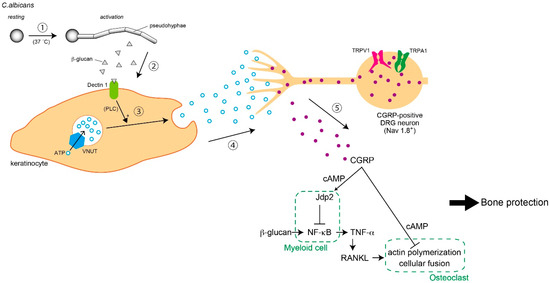 Bone protection system from Candida infection. Bone disruption followed by inflammation is worsened by overactive osteoclasts. Nociceptors suppress osteoclast development through calcitonin gene-related peptide (CGRP) release. The process involves: (1) Candida albicans is activated in an optimal environment (e.g., body temperature); (2) β-glucan released from pseudohyphae bind to its receptor, dectin-1, on the plasma membrane of keratinocytes; (3) ATP release from keratinocytes is enhanced through the phospholipase C (PLC) pathway; (4) neuronal excitation in voltage-gated sodium channel 1.8 (Nav1.8)-positive dorsal root ganglion (DRG) neurons; and (5) CGRP release from DRG neurons. Jun dimerization protein 2 (Jdp2) is activated by CGRP through a cAMP cascade in myeloid cells. In turn, tumor necrosis factor-alpha (TNF-α release (which accelerates osteoclast development) is suppressed. TNF-α-dependent inflammation is induced by the direct effect of β-glucan on myeloid cells. Furthermore, the CGRP–cAMP axis in osteoclasts also inhibits over-development. Thus, these pathways from skin to bone induce bone protection and inhibit bone inflammation during fungus infection.