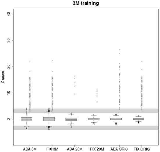 Boxplots of euploid NIPT samples for ADAVAR and FIXVAR models trained with samples subsampled to 3M reads uniquely mapped to autosomes. Models have been tested with equivalent samples subsampled to 3M (ADA 3M, FIX 3M) and 20M (ADA 20M, FIX 20M) respectively and with original (ORIG) read count of reads uniquely mapped to autosomes (ADA ORIG, FIX ORIG). Grey crosses represent trisomic samples. Samples in the grayed areas defined by ranges (2.5, 4) and (−4, −2.5) represent uninformative calls.