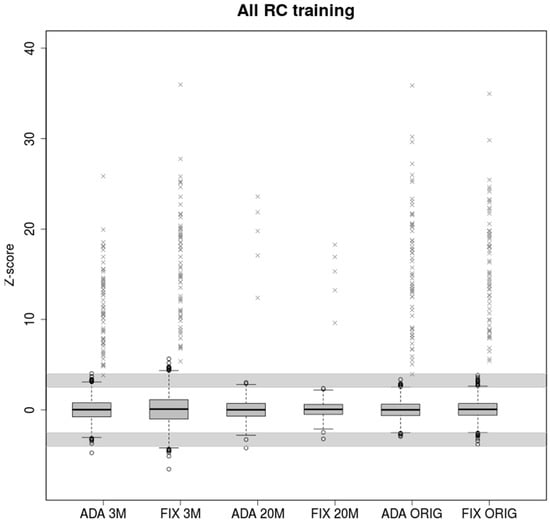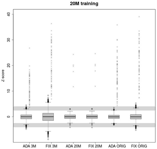 Boxplots of euploid NIPT samples for ADAVAR and FIXVAR models trained with samples subsampled to 20M reads uniquely mapped to autosomes. Models have been tested with equivalent samples subsampled to 3M (ADA 3M, FIX 3M) and 20M (ADA 20M, FIX 20M) respectively and with original read count of reads uniquely mapped to autosomes (ADA ORIG, FIX ORIG). Grey crosses represent trisomic samples. The grey areas defined by ranges (2.5, 4) and (−4, −2.5) represents uninformative calls.