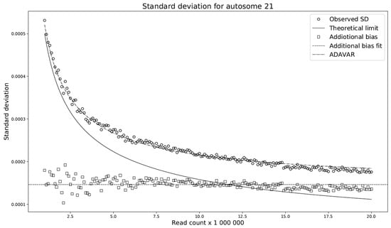Comparison of standard deviations with respect to the selected read count among the individual models. Observed SD mean observed standard deviation for FIXVAR model. The theoretical limit denoting calculated standard deviation for ADAVAR model and constant dash line represents additional bias across various read counts used by ADAVAR. The prediction of the standard deviation of the theoretical limit (solid line) is not in good agreement with the reference/observations (circles), presumably due to individual CNVs. Observe that the difference between reference/observations (circles) and predicted standard deviations (theoretical limit) is approximately constant throughout the whole range (squares), and adding the mean of the differences to the predicted standard deviation yields a very good approximation of the observations (dash-dot line).