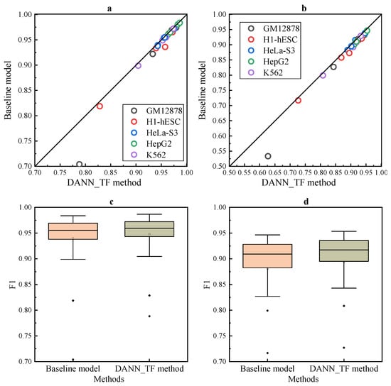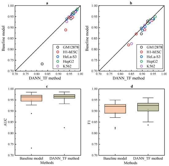 Performance for cross-cell-type prediction. Scatter plot depicting (a) AUC and (b) F1 score of DANN_TF and the baseline method. Box plots depicting (c) AUC and (d) F1 score of DANN_TF and the baseline method.
