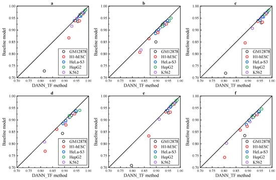Results of DANN_TF in Figure 1a,b show that DANN_TF achieves higher AUC and F1 score than the baseline method for most cell-type TF pairs. A cell-type TF pair denotes a prediction task.