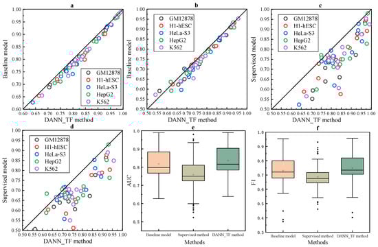 AUCs of cross-cell-type prediction by DANN_TF and the baseline method and that of supervised prediction by the baseline method. Scatter plots depicting the AUC comparison between (a) DANN_TF and the baseline method and that (b) between DANN_TF and supervised prediction. Scatter plots depicting the F1 comparison between (c) DANN_TF and the baseline method and that between (d) DANN_TF and supervised prediction. Box plots depicting (e) the AUC comparison and (f) the F1 comparison between DANN_TF, the baseline method and supervised prediction.
