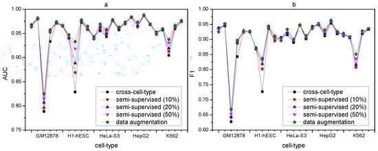 (a,b) denote AUC performance and F1 score comparison between data augmentation, semi-supervised, and cross-cell-type prediction, respectively.