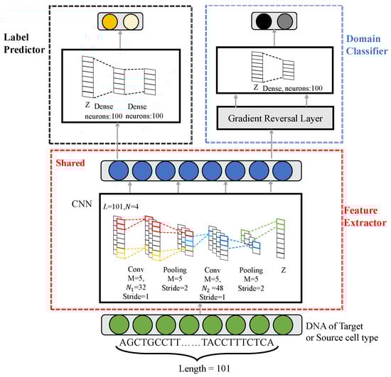 where x denotes an input DNA sequence, L and D denote the true label and the true domain of the input DNA sequence x, respectively, is calculated by Formula (10). The reason that the domain loss is multiply by a negative value is that DANN_TF can help learn features shared by the target cell type and source cell types by decreasing the performance of the domain classifier. Then, learned features can aim to make predictions for TFs in the target cell type.