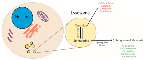 Ceramides are hydrolyzed to sphingosine by ceramidases. Sphingosine is then converted to S1P by sphingosine kinase-1 (SPHK1) or sphingosine kinase-2 (SPHK2). S1P also regulates autophagy but, unlike ceramides, induces a protective autophagic process [83]. Given the opposite effects of ceramides and sphingosine on autophagy, AC, an enzyme playing a key role in the conversion of ceramides into sphingosine, is pivotal in cell activity and fate.