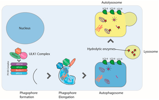 The mechanism involved in tethering and fusion of incoming membranes to phagophore seems to be regulated by PI3K and the Unc-51-like autophagy activating kinase (ULK). These enzymes contribute to the formation and stabilization of phagophore curvature, through the production of PI3P [65]. In this phase, ATG and microtubule-associated proteins 1A/1B light chain 3B (LC3) regulate the double membrane generation. LC3 is a central protein in autophagy and crucial for autophagosome biogenesis, hence LC3 is also used as a marker of autophagosome formation. During autophagosome formation, LC3 is hydrolyzed by ATG proteins and binds phosphatidylethanolamine [66]. This conjugated compound called LC3-II is believed to be involved in the expansion of autophagosome membrane and to be necessary for the fusion events taking place thereafter [67,68].