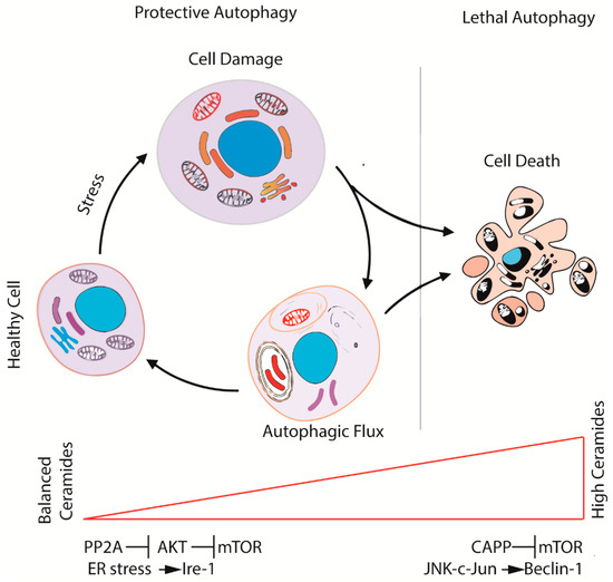 As mentioned, ceramides are at the crossroads between protective and lethal autophagy (Figure 3). In protective autophagy, ceramides may inhibit AKT protein kinase by activating pyrophosphatase protein 2A (PP2A); AKT interferes with the mammalian target of rapamycin (mTOR) kinase pathway, the main negative regulator of autophagy [80]. In other circumstances, ceramides can induce stress to the endoplasmic reticulum (ER), resulting in activation of the ER stress sensor inositol-requiring element 1 (IRE-1). Activation of this stress pathway leads to apoptosis within a certain time span [81]. Ceramides can also induce lethal autophagy, an irreversible process called type II cell death. In this case, they induce the activation of phosphatase-associated proteins (CAPP) that inhibit mTOR [82]. Finally, ceramides are also involved in the increase of autophagic protein Beclin-1 through activation of the transcription factor c-Jun. It is still unclear how ceramides might play this dual regulation of autophagic flux, but the induction of lethal autophagy may depend on the existence of cellular microdomains where ceramides localize to activate different biological roles.