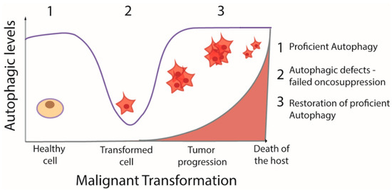 Schematic model of the role of autophagy during cancer progression. Proficient autophagy is blocked during cell transformation and restored in the advanced phases of tumor progression.