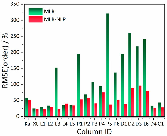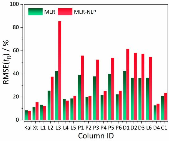 Relative difference in retention time and elution order %RMSE values between MLR and MLR-NLP models. The legend for the X-axis is analogous to the one in Figure 2. Abbreviations: %RMSE—percentage root mean square error, MLR—multiple linear regression, MLR-NLP—MLR–non-linear programming.