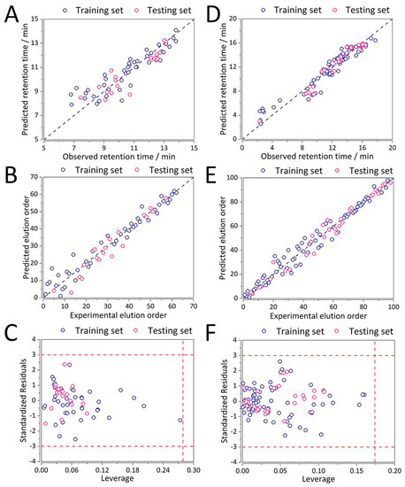 Performance of the MLR-NLP method for prediction of (A) retention time, (B) elution order, and (C) applicability domain for case study 1 (separation of organic molecules using Supelcosil LC, tG = 10 min, T = 35 °C), (D) prediction of retention time, (E) elution order, and (F) applicability domain for case study 2 (separation of synthetic peptides on Xterra, tG = 20 min, T = 40 °C). Abbreviations: tG—gradient retention time, T—temperature.