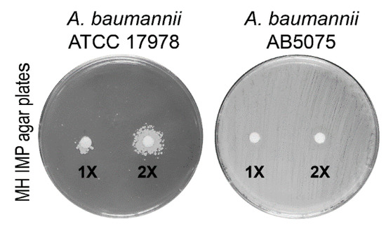 - Kuo, H.Y.; Chang, K.C.; Kuo, J.W.; Yueh, H.W.; Liou, M.L. Imipenem: A potent inducer of multidrug resistance in Acinetobacter baumannii. Int. J. Antimicrob. Agents 2012, 39, 33–38. [Google Scholar] [CrossRef]