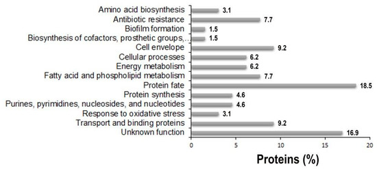 Currently, proteomic studies on the cell envelope of MDR A. baumannii have been aimed at characterizing the outer and inner membrane sub-proteomes as well as the extracellular proteome under different growth conditions [10,11,12,13]. Instead, the composition and dynamics of A. baumannii periplasm remain largely uncharacterized. Therefore, the aim of this study was to get insights in A. baumannii periplasmic proteome and apply comparative proteomics to investigate the regulation of protein expression under sub-inhibitory concentration of imipenem (IMP). The fully sequenced MDR A. baumannii AB5075 strain, belonging to the ICL 1, was chosen for its antibiotic resistance profile and increased virulence in animal models [14,15]. Herein, we characterized, for the first time, the periplasmic proteins of strain AB5075 using a proteome approach. By comparing the periplasmic proteomes in the absence and presence of a sub-inhibitory IMP concentration, eight differentially expressed proteins involved in protein fate, responses to oxidative stress and energy metabolism were identified.