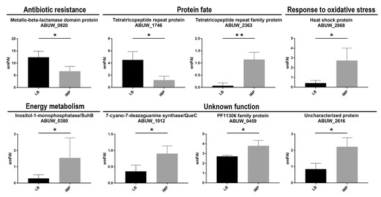 Semi-quantitative analysis of differentially expressed periplasmic proteins from strain AB5075 grown in LB or LB supplemented with IMP. The data are the means ± standard deviation from three independent experiments. The functional categories of periplasmic proteins identified assigned as previously described are shown. The emPAI and statistical significance values are shown. Asterisks represent p values evaluated by t test; ** p < 0.01, * p < 0.05.