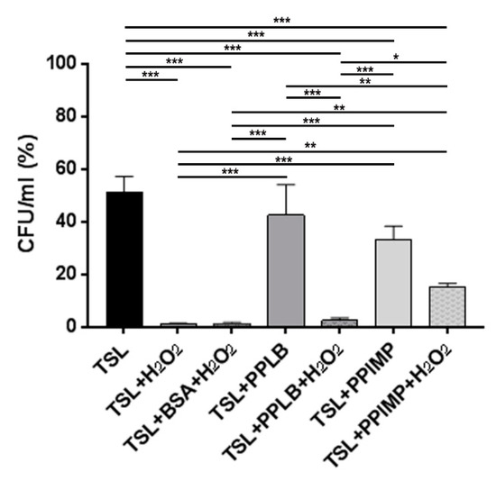 The survival rates of AB5075 cells incubated with periplasmic fractions extracted from A. baumannii cultures grown in the presence and absence of IMP and challenged with 2 mM of H2O2. Bacterial starting viability was controlled by re-suspending the inoculum used in this assay (1 × 106/mL) in sodium chloride 0.9% (NaCl) which was set as 100% (not shown). Due to its composition, the periplasmic extraction buffer TSL (30 mM Tris-HCl–20% sucrose (pH 8.1), lysozyme 100 mg/mL in 0.1 M EDTA [pH 7.3]) was used as the control. The untreated and H2O2-treated bacteria resuspended in the periplasmic extraction buffer TSL in the presence of periplasmic extracts extracted from cells grown in LB (PPLB) or in LB supplemented with IMP (PPIMP). The untreated and H2O2-treated bacteria with or without the addition of 50 µg/mL of bovine serum albumin (BSA) to buffer hydroxyl radicals served as controls. Asterisks represent p values evaluated by one-way ANOVA; *** p < 0.001, ** p < 0.01, * p < 0.05.