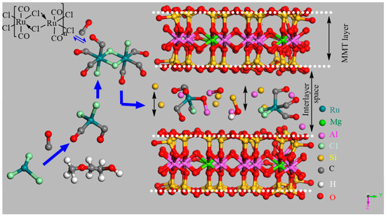 The intercalation of CO-releasing molecule-2 (CORM-2) [Ru(CO)3Cl2]2 inside the Montmorillonite (MMT) layers presented through Material Studio software.