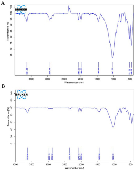 The reaction mechanism is monitored through Infrared spectroscopy. When carbonylation is completed using ethylene glycol monomethyl ether as solvent (Ru@MMT-1), the ruthenium metal carbonyl coordination appears at 1986 and 2058 cm−1 absorption bands. Furthermore, the absorption band at 3631 cm−1 is caused by the stretching vibration of the hydroxyl group in the Al-OH and the vibration of the Si-O-Si skeleton has been found at 1042 cm−1 band (Figure 3A). When solvent is replaced with ethylene glycol ether (Ru@MMT-2) same observation has been monitored with slightly different absorption bands. The 2072 and 2003 cm−1 band referred to the ruthenium metal carbonyl coordination. The 3628 cm−1 band is caused by the stretching vibration of the hydroxyl group in the Al-OH, and the Si-O-Si skeleton vibration at 1036 cm−1 band as shown in IR spectra (Figure 3B).