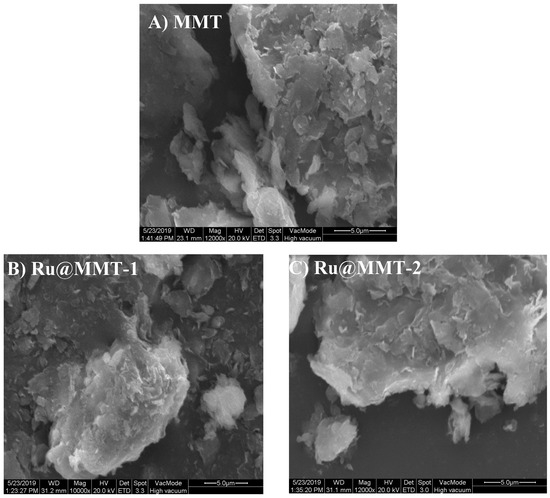 The Scanning electron microscopy (SEM) micrograph of Na-MMT (A), Ru@MMT-1 (B) and Ru@MMT-2 (C) at 5.0 provided the information about the layers formation.