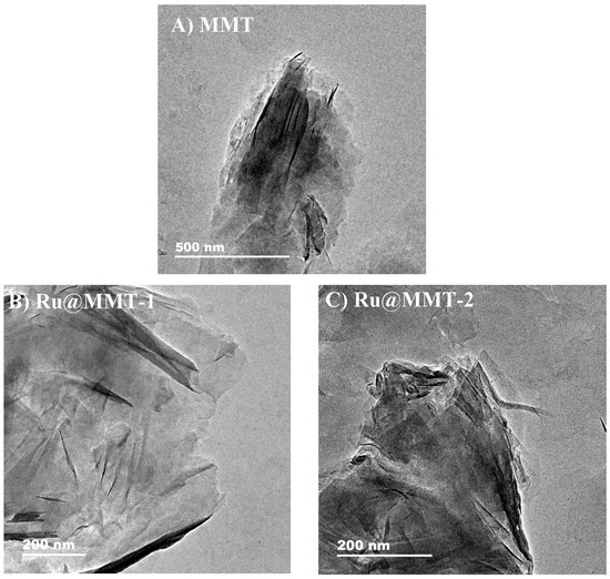 The Transmission electron microscope (TEM) of Na-MMT (A), Ru@MMT-1 (B) and Ru@MMT-2 (C) clarified their layered structures existence.