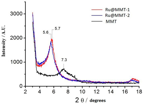 The X-ray diffraction (X-ray) observed the characteristic peaks of Ru@MMT-1 and Ru@MMT-2 at 5.7 and 5.6 degree as a consequence of exfoliation.