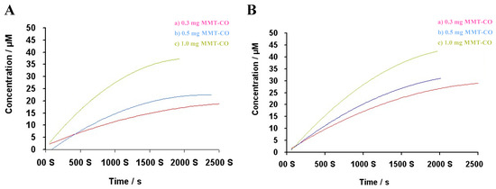 Considering the release kinetic curve at two different concentrations of 0.3 mg sample product (Figure 9), it can be seen that the equilibrium concentrations of Mb-CO were 18 uM and 28 uM respectively. The volume of Mb-CO is 1000 uL. Thus, the amount of Mb-CO is 0.018 and 0.028 umol respectively. According to the relationship of CO + Mb → Mb-CO, it was calculated that the amounts of carbonyl groups contained in the two products were 0.018 umol and 0.028 umol respectively (back-calculation). As the concentration of Ru@MMT-1 increases, the released CO amount also increased, although their half-life was relatively close to each other. In the case of Ru@MMT-2, as the concentration increases, the released CO amount also increased. Thus, the releasing mechanism becomes faster and faster. Compared with CORM-3 half-life (3.6 min, we found that CO-MMT has a higher half-lives indicating that MMT has a better-sustained release effect.