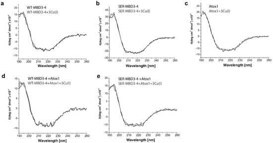 Circular dichroism (CD) spectra of (a) WT-MBD3-4; (b) SER-MBD3-4; (c) Atox1; (d) WT-MBD3-4 with Atox1; and (e) SER-MBD3-4 with Atox1 in the absence (black line) and presence of Cu(I) (gray line).
