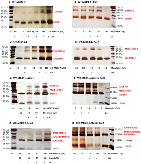 SDS-PAGE of cross-linking experiments of ATP7B (MBD3-4). (a) Increasing concentrations of WT-MBD3-4 were incubated 30 min or overnight (o.n.) with 0.1% glutaraldehyde (GA) at room temperature (RT); (b) WT-MBD3-4 (50 µM) was incubated for 30 min with Cu(I) at different ratios and then for 30 min with 0.1% GA at RT; (c) Same as (a) with SER-MBD3-4 mutant; (d) Same as (b) with SER-MBD3-4 mutant; (e) Atox1 (50 µM) was incubated for 30 min with increasing concentrations of WT-MBD3-4 and then for 30 min or overnight (o.n.) with 0.1% GA at RT; (f) WT-MBD3-4 and Atox1 (50 µM) were incubated for 30 min with Cu(I) at different ratios and then for 30 min with 0.1% GA at RT; (g) Same as (e) with SER-MBD3-4 mutant; (h) Same as (f) with SER-MBD3-4 mutant.