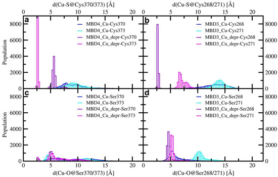 Distribution of distances between Cu(I) and the cysteine residues of MBD4 (a), and MBD3 (b), and the serine residues of MBD4 (c), and MBD3 (d) in the complexes of holo Atox1 with WT/SER-MBD3/4 considering for (c) and (d) the protonated and deprotonated cysteine residues (blue—the distance between Cu(I) and protonated S/O@Cys/Ser370/268; cyan—the distance between Cu(I) and protonated S/O@Cys/Ser373/271; violet—the distance between Cu(I) and deprotonated S/O@Cys/Ser370/268; magenta—the distance between Cu(I) and deprotonated S/O@Cys/Ser373/271).
