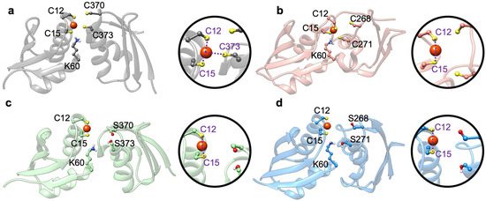 As observed for the WT complex [49], the flexibility of the Atox1-Cu(I)-MBD4_depr adduct was lowered with respect to the other systems (Figure 5c). This was particularly evident in the Cu(I)-binding region of both proteins. The predominant structure obtained from the cMD trajectory displayed Cu(I) bound by two cysteine residues of Atox1 and strongly interacting with C373 from MBD4 (Figure 6a). The adduct was also stabilized by an H-bond between K60@Atox1 and S373@MBD4 (Table A1). Conversely, by introducing serine mutations, these residues did not directly interact with Cu(I) and the T369@MBD4 H-bonds did not interact with C12@Atox1 (Figure A4b,e and Table A3).