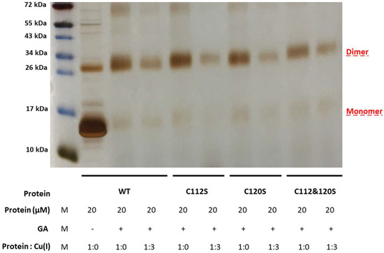 SDS-PAGE of cross-linking experiments of CueR. WT and mutated proteins (CueR_C112S, CueR_C120S, and CueR_C112S_C120S) were incubated with or without Cu(I) for 30 min at a 1:3 ratio and then for another 30 min with 0.6% GA at RT.