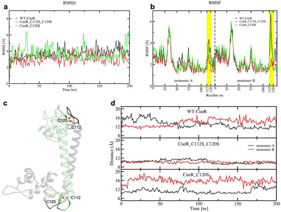 To characterize, at the atomic level, the impact of introducing serines, we also performed 200 ns-long cMD simulations of three systems (WT-CueR, CueR_C112S_C120S, and CueR_C120S). Simulations were performed without DNA, as this latter was absent in the crystal structure used to model this system. Here, we did not consider the CueR_C112S model as we did not expect any major difference in the behavior of CueR_112S with respect to CueR_C120S. RMSD and RMSF (Figure 10a,b) revealed that all systems are rather flexible. Nevertheless, the flexibility was mostly localized on the metal binding loop, being the highest in WT-CueR, whereas it decreased progressively in the CueR_C120S and CueR_C112S_C120S systems.