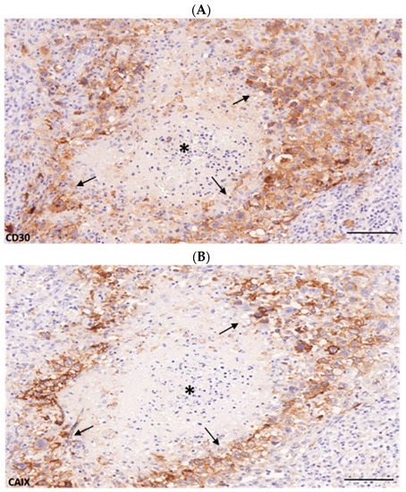 CD30 expression (A) representing Hodgkin–Sternberg–Reed (HRS) cells and partially carbonic anhydrase IX (CAIX) positivity (B) demonstrating hypoxia-related adaptation in a subset of the neoplastic compartment surrounded by reactive cell masses characteristic for classical Hodgkin’s lymphoma (cHL). Variable levels of membrane/cytoplasmic CAIX expression could be observed in the neoplastic HRS cells while the non-neoplastic background remained virtually negative. Samples with necrosis showed intense CAIX expression in the perinecrotic area (arrows). Asterix indicates the center of the necrotic area. Scale bar = 100 μm.