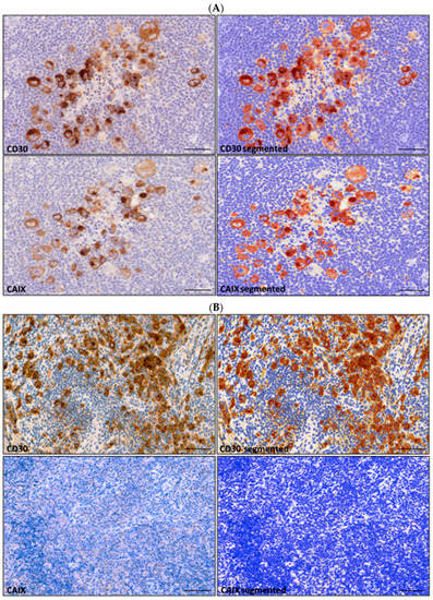 In our previous study, we examined the expression of CAIX in HRS-cells of cHL samples using immunohistochemistry and concluded that high CAIX expression influences disease outcome and may play a special role in the short term failure of the applied chemotherapy [15]. However, due to the variable number and uneven distribution of neoplastic HRS cells in the background of the non-neoplastic inflammatory cells, the exact quantification of CAIX immunopositivity was not enabled by conventional light microscopy. Therefore, we decided to perform a quantitative evaluation of HRS cells using digitalized slides enabling objective selection and segmentation of specific immunolabeling in the relevant tissue areas. Whole slide digital analysis (WSD) provides the visual control of the neoplastic cells and their microenvironment for the same time, which is especially challenging in cHL [16,17]. Literature is available on image analysis approaches in a wide range of tumors, however, the number of studies on cHL is still limited [18,19,20]. According to our current approach, CD30 IHC labeling was applied as the most accurate way to represent the total amount of HRS cells which can be used as a reference for further functional studies. In the present work, the expression of CD30 and CAIX was measured in parallel within digital slides to establish the relation between the malignant cell burden (represented by CD30 positive HRS cells) and adaptive changes highlighted by CAIX-related immunolabeling.